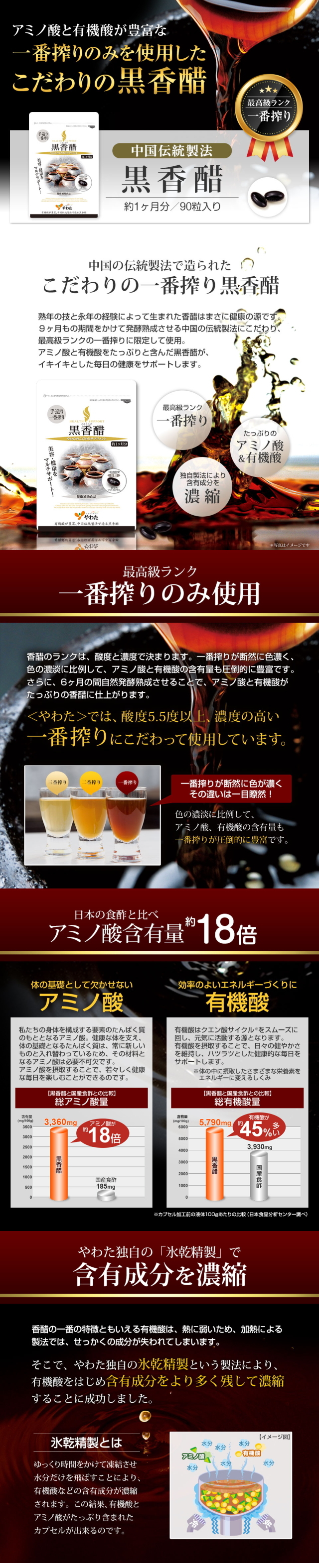 | 主要成分 | 【2粒当たり】クエン酸:0.092mg、コハク酸:0.40mg、乳酸:19mg、酢酸:7.8mg、アルギニン:26mg、リジン:10mg、ヒスチジン3.2mg、フェニルアラニン:8.0mg、チロシン:2.2mg、ロイシン:12mg、イソロイシン:5.4mg、メチオニン:4.4mg、バリン:9.4mg、アラニン:36mg、グリシン:74mg、プロリン:42mg、グルタミン酸:42mg、セリン13mg、スレオニン9.8mg、アスパラギン酸:20mg、トリプトファン:0.12mg、シスチン0.80mg、γ-アミノ酪酸(GABA):0.28mg |