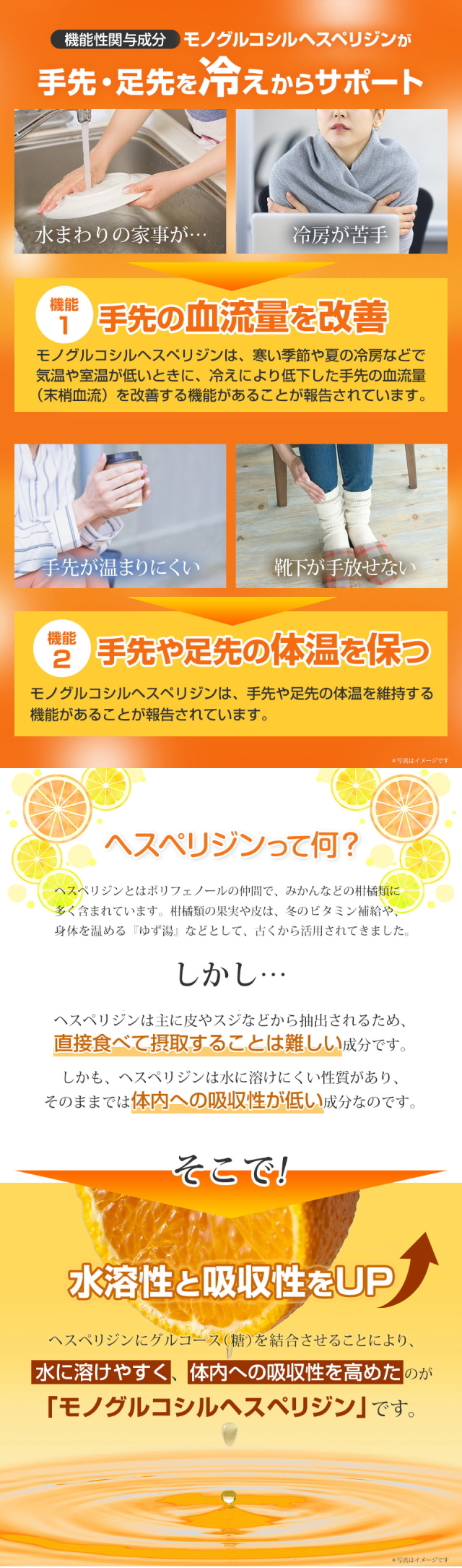 | 主要成分 | 【3粒当たり】【機能性関与成分】モノグルコシルヘスぺリジン:340mg |
